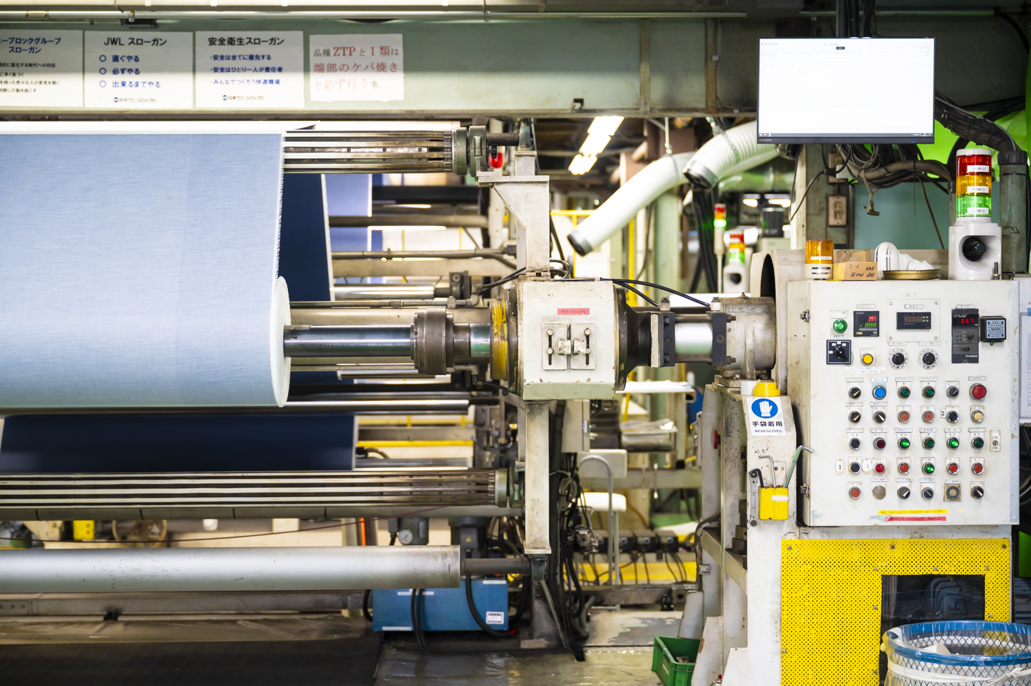特殊な素材を加工するため、ものづくりもいわゆる「切ったり貼ったり」といった製造工程ではありません。原材料となる粉や液体を配合し、塊状にしてシートに圧延していく。まさに素材づくりの根幹から携わっています。技術開発部が配合のレシピを決めてはいますが、製造現場ではその日の気温や湿度、天気、機械の温度といったわずかな条件の違いで仕上がりが変わってしまう。だからその微妙な差をオペレーターが調整しながら、最適な状態に持っていく必要があります。